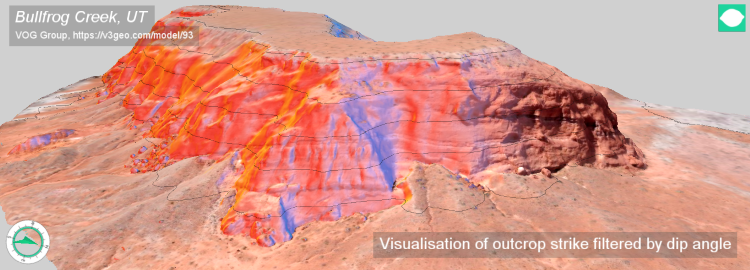 Virtual outcrop model overlain with geological strike layer and filtered by dip angle to remove low-angle areas (Bullfrog Creek (Entrada), VOG Group, https://v3geo.com/model/93).