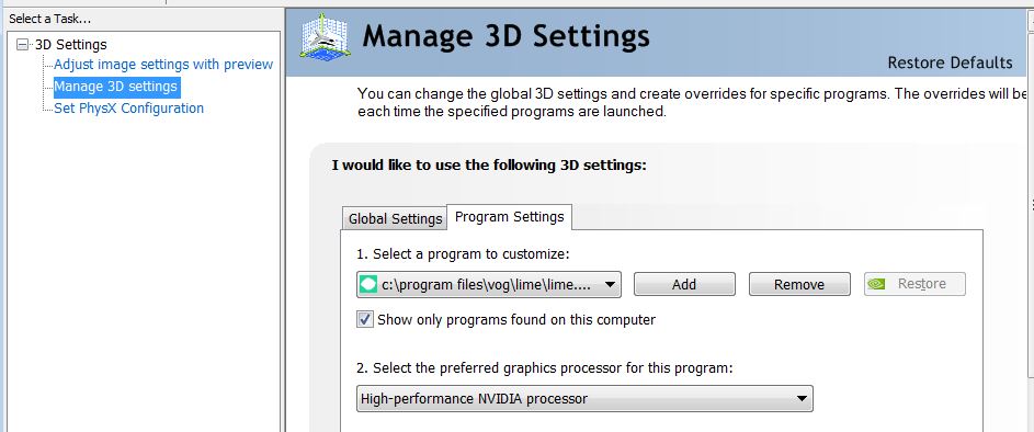 Modern laptops often ship with a dedicated high performance graphics card to run 3D graphics software, and an “integrated” card for general purpose usage (such as for document handling, playing movies etc). The graphics card drivers and operating system handle the switch between the two depending on which software is run. However, the OS does not always get it right, and you may need to override which graphics card is chosen to run LIME. For NVIDIA cards (recommended), the procedure is as follows (Windows 7):
