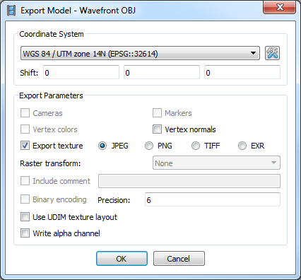 Export model as Wavefront OBJ (*.obj). If the model is georeferenced, select the appropriate projected coordinate system (for example UTM, national grid or local coordinates). Models exported with a geographic coordinate system (i.e. lat/long) are not compatible with LIME at this time. For versions of LIME prior to 1.1, the Shift (offset) parameter must be set for the X and Y coordinates to reduce large coordinate values. This avoids “jitter” when navigating in 3D caused by graphics card precision. We recommend that the offset is still used for maximum compatibility with other 3D graphics software.